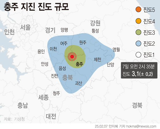 [4] 조선일보 - 충주 북서쪽서 규모 3.1 지진…“흔들림 느꼈다” 신고 잇따라 (https://www.chosun.com/national/national_general/2025/02/07/PVDXIFRFWNF53M4XMRAUUYU62U/)