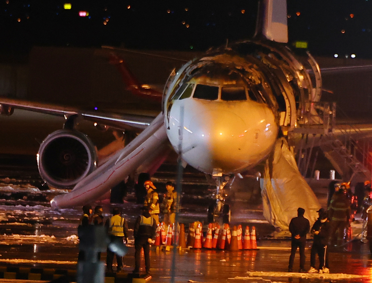 이 장면은 화재가 발생한 항공기의 모습으로, 많은 응급 구조원들이 현장에서 상황을 파악하고 있는 모습입니다.